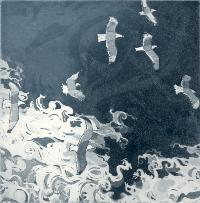 This etching featuring a Greek ferry trip is printed on off white Hanemulhe etching paper using coloured inks. Previously on sale in the etching shop at £120.
