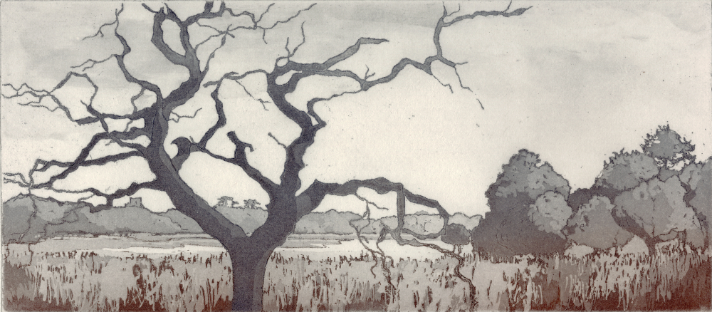 This etching featuring Snape Marshes is printed on off white Hanemulhe etching paper using coloured inks. Previously on sale in the etching shop at £150.